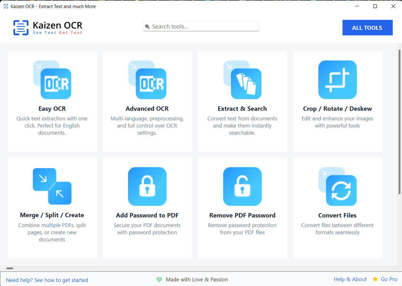 Welcome to the official help documentation for Kaizen OCR & PDF, a 100% offline Windows desktop application for text extraction, document conversion, and PDF processing. All processing happens locally on your machine -- no internet required, your data stays private.
