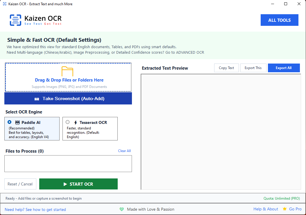 Easy OCR lets you quickly extract text from images, PDFs, or screenshots with just a few clicks. Simply drag & drop your files or capture a screenshot, then press Start OCR -- no complex setup needed. It's designed for fast, accurate results with a clean and user-friendly interface.