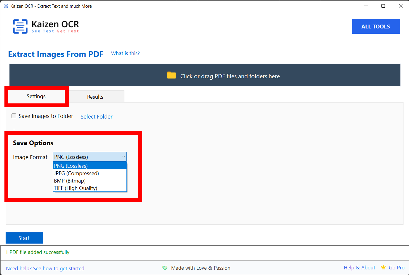 The Extract Images from PDF feature lets you quickly pull all images from PDF files without losing quality. Simply drag & drop your PDF, choose the image format you want (PNG, JPEG, BMP, or TIFF), and click Start to extract images instantly.