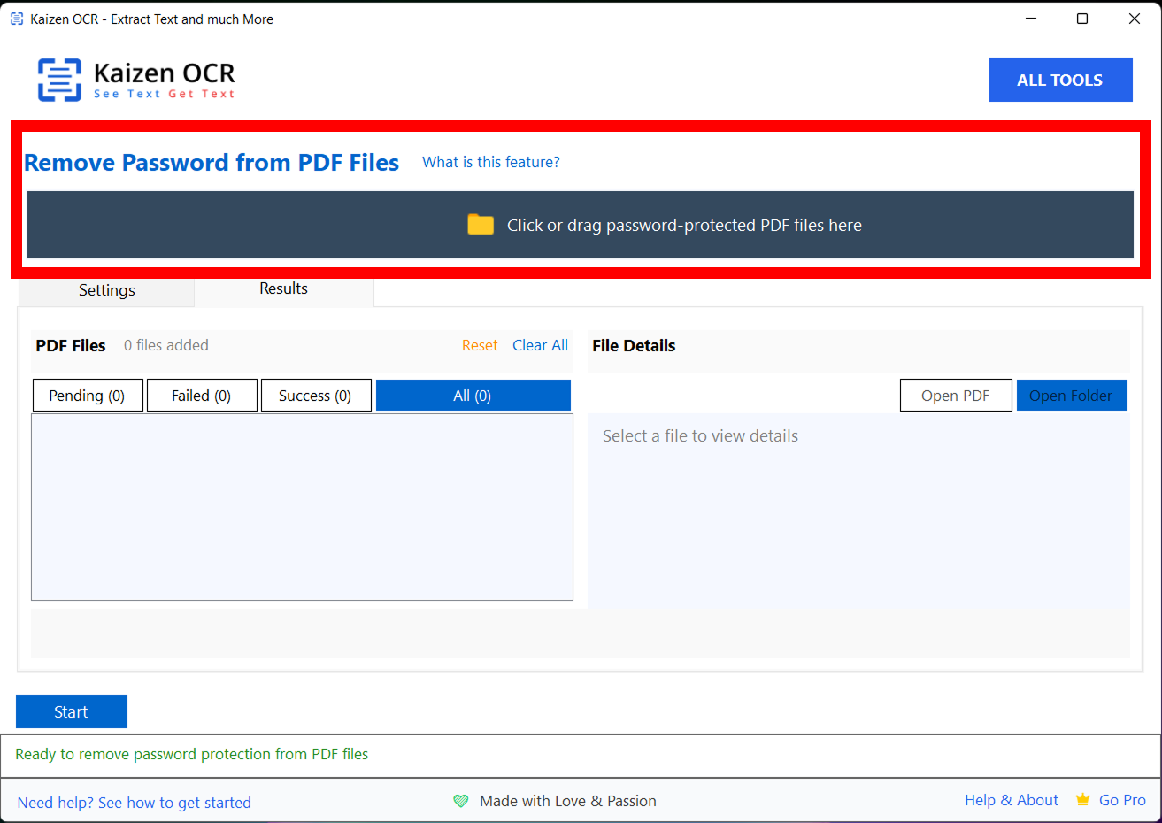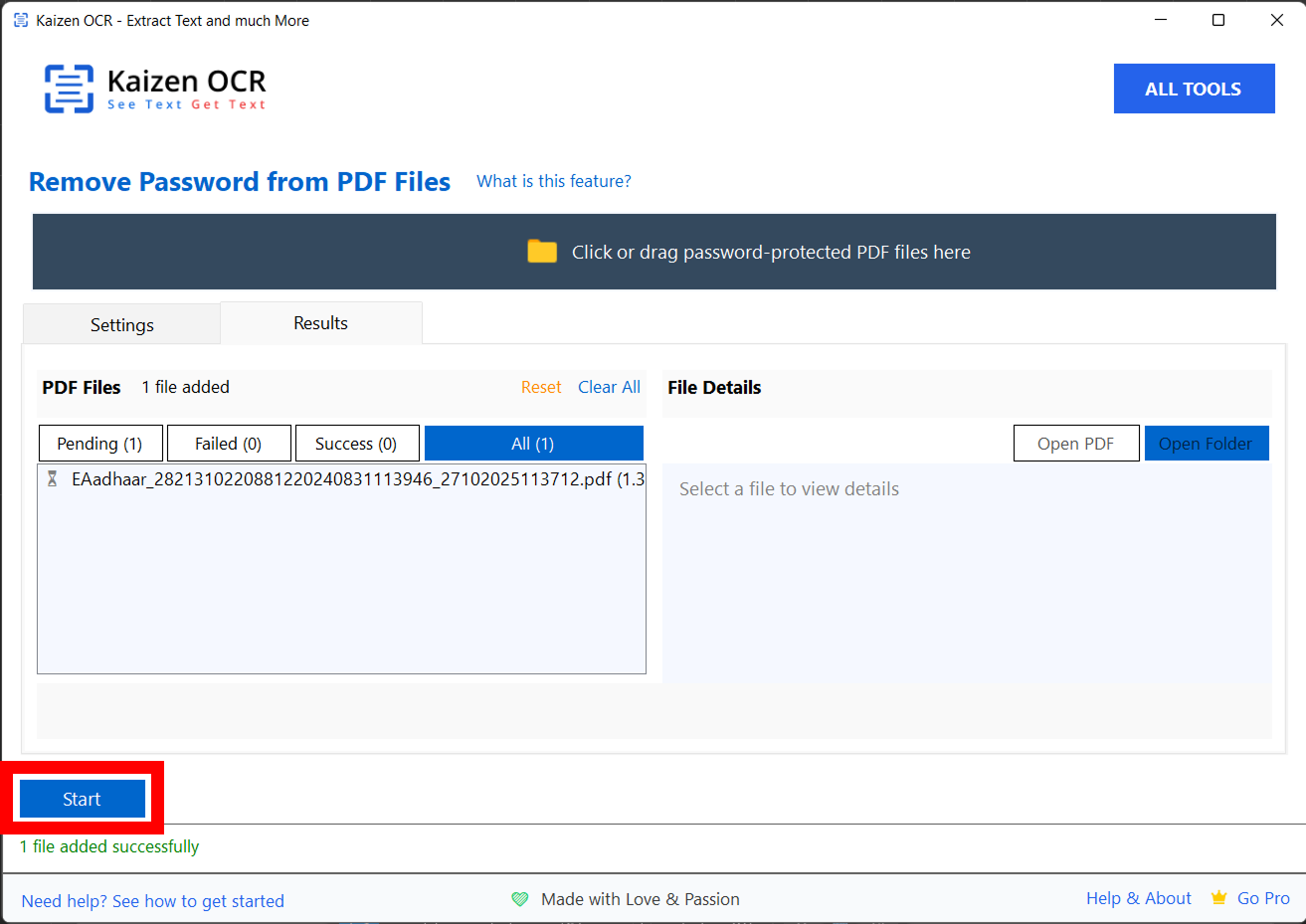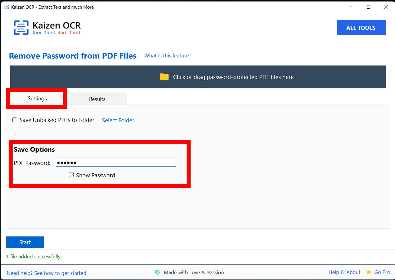 The Remove Password feature helps you unlock password-protected PDF files for easier access and sharing. Simply add your protected PDF, enter the correct password, and click Start to remove the password instantly.