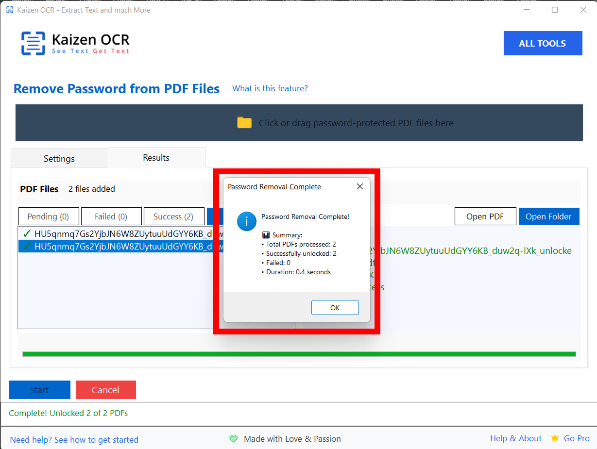 The unlocked PDF will be saved to your specified folder. A confirmation message will indicate the password has been successfully removed.