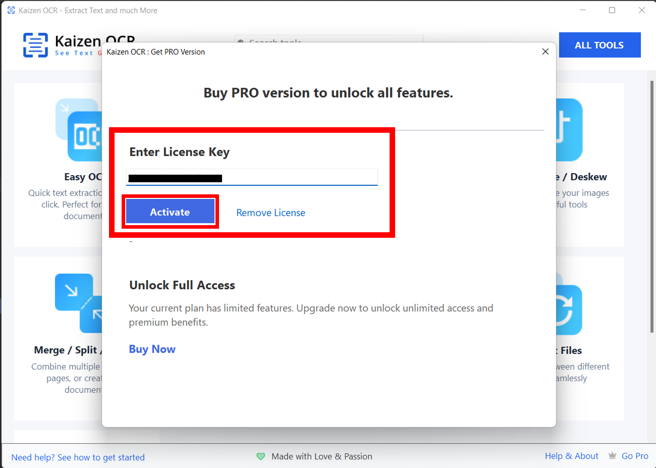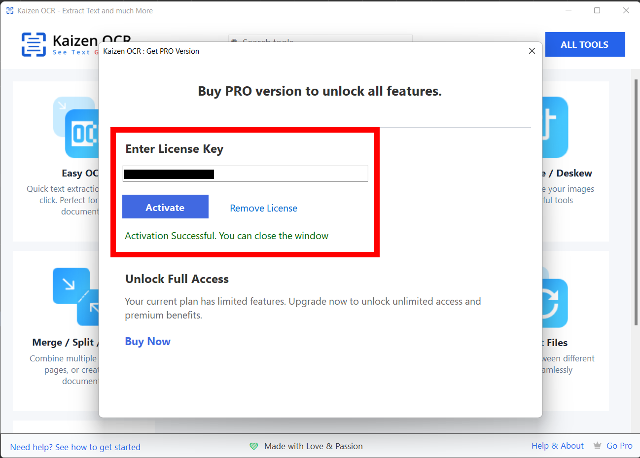 Once validated, you will see a confirmation message. Your license is now active, and all features are unlocked with unlimited usage.