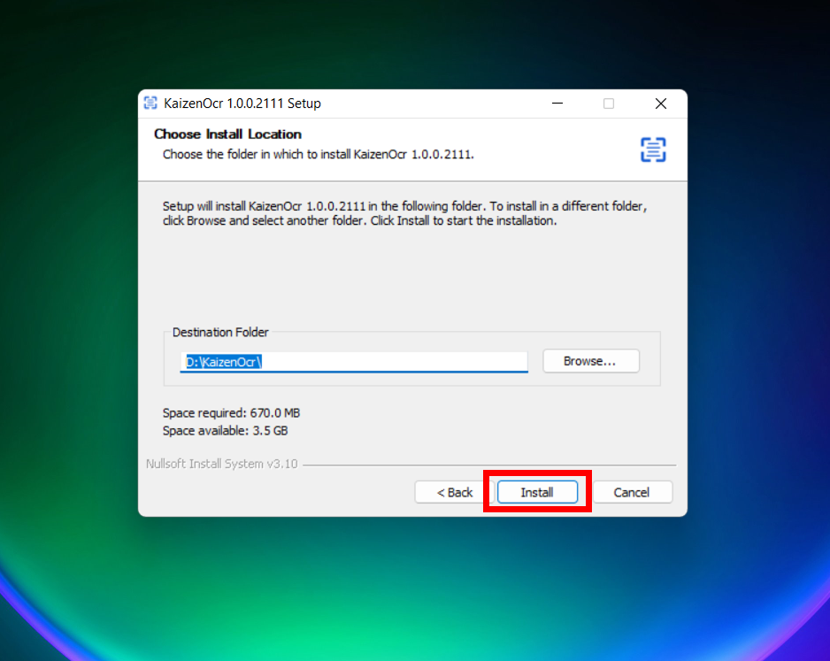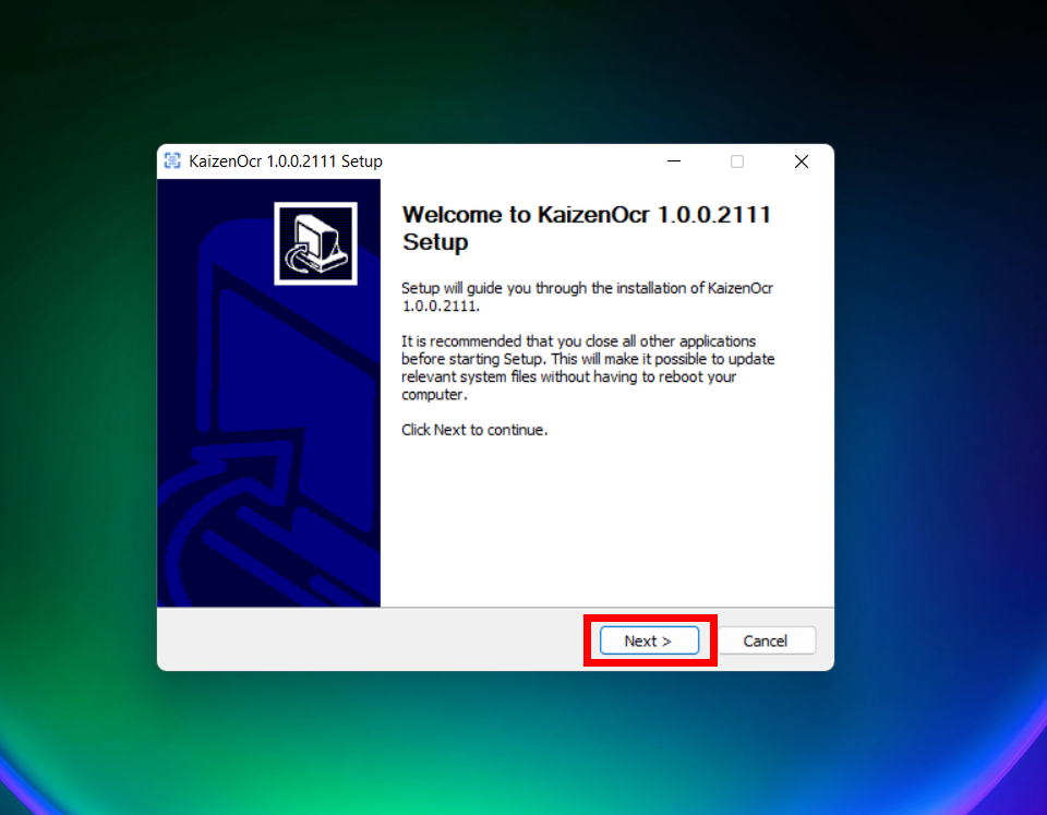 Locate the downloaded file and double-click KaizenOcrInstaller.exe to launch the setup wizard. Click Next to proceed.